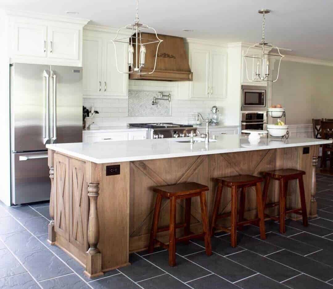 Islands in modern farmhouse kitchens feel like furniture—use tile or slab treatments to reinforce that.