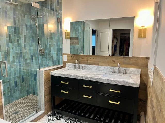 - Shower floors in 1″–2″ hex or tumbled marble mosaic for traction and charm.